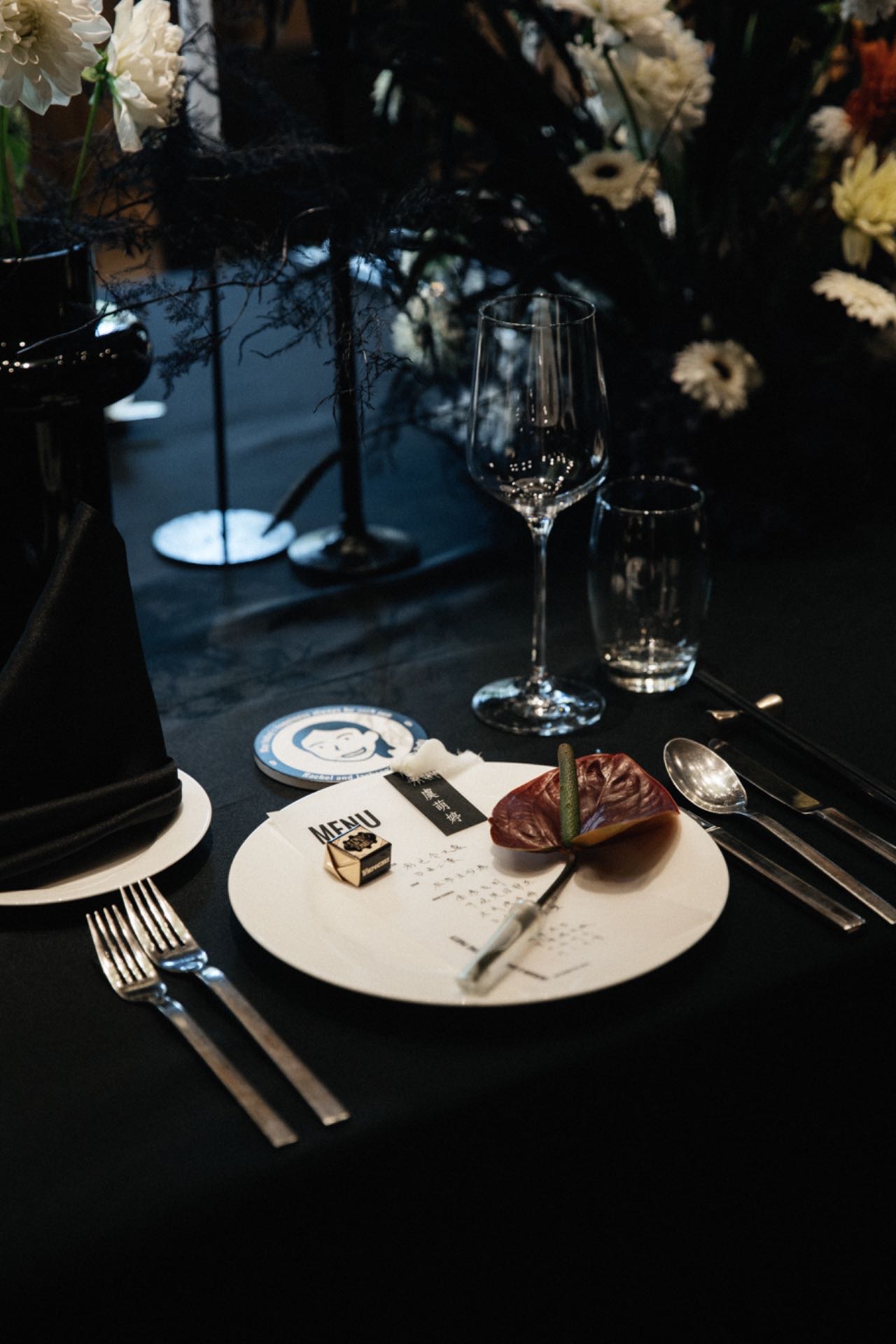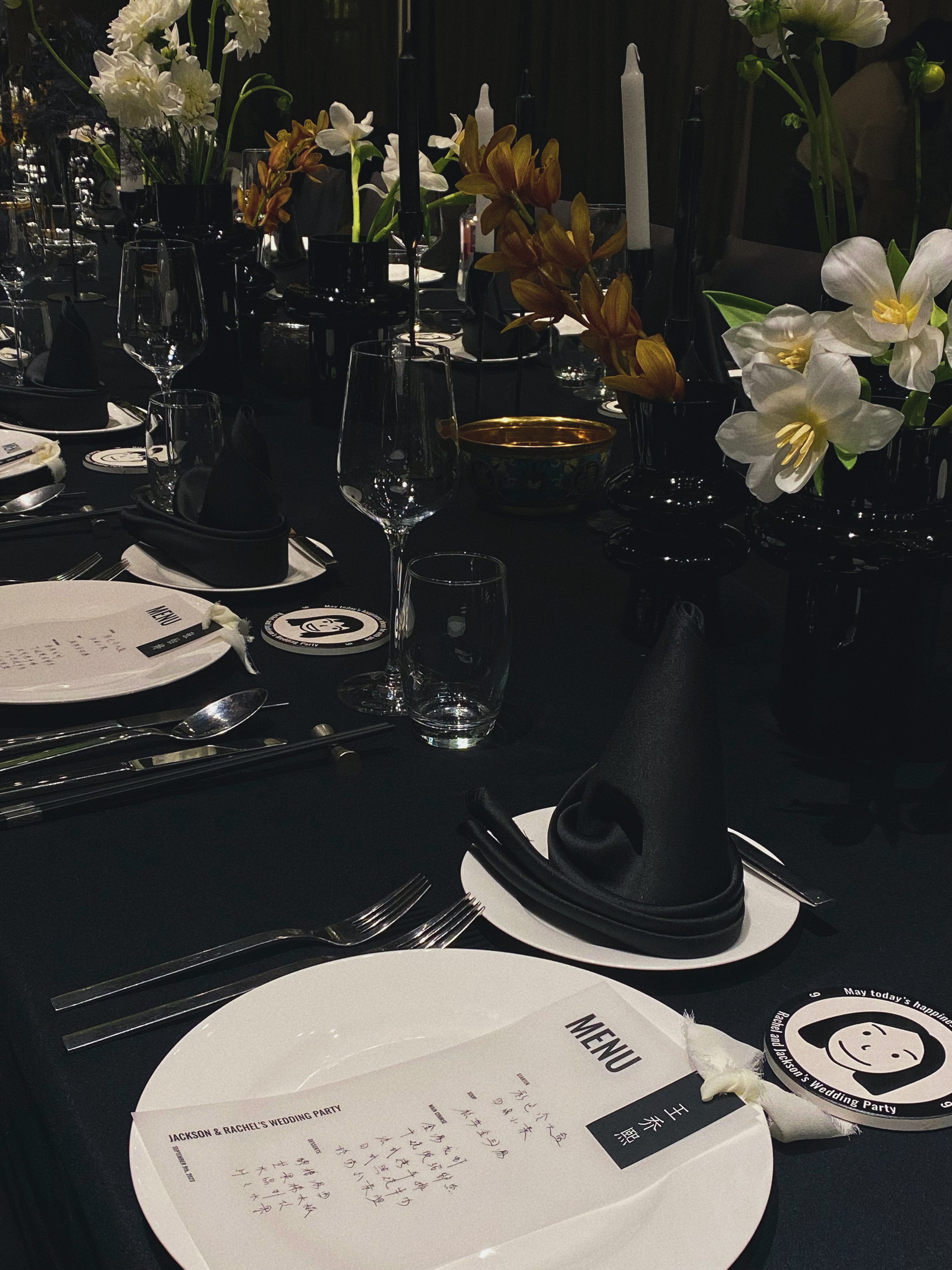 The wedding venue is a study in contrast. Black tablecloths are offset by vibrant flowers. The interplay of light and shadow creates a visually captivating atmosphere that is both dramatic and romantic.